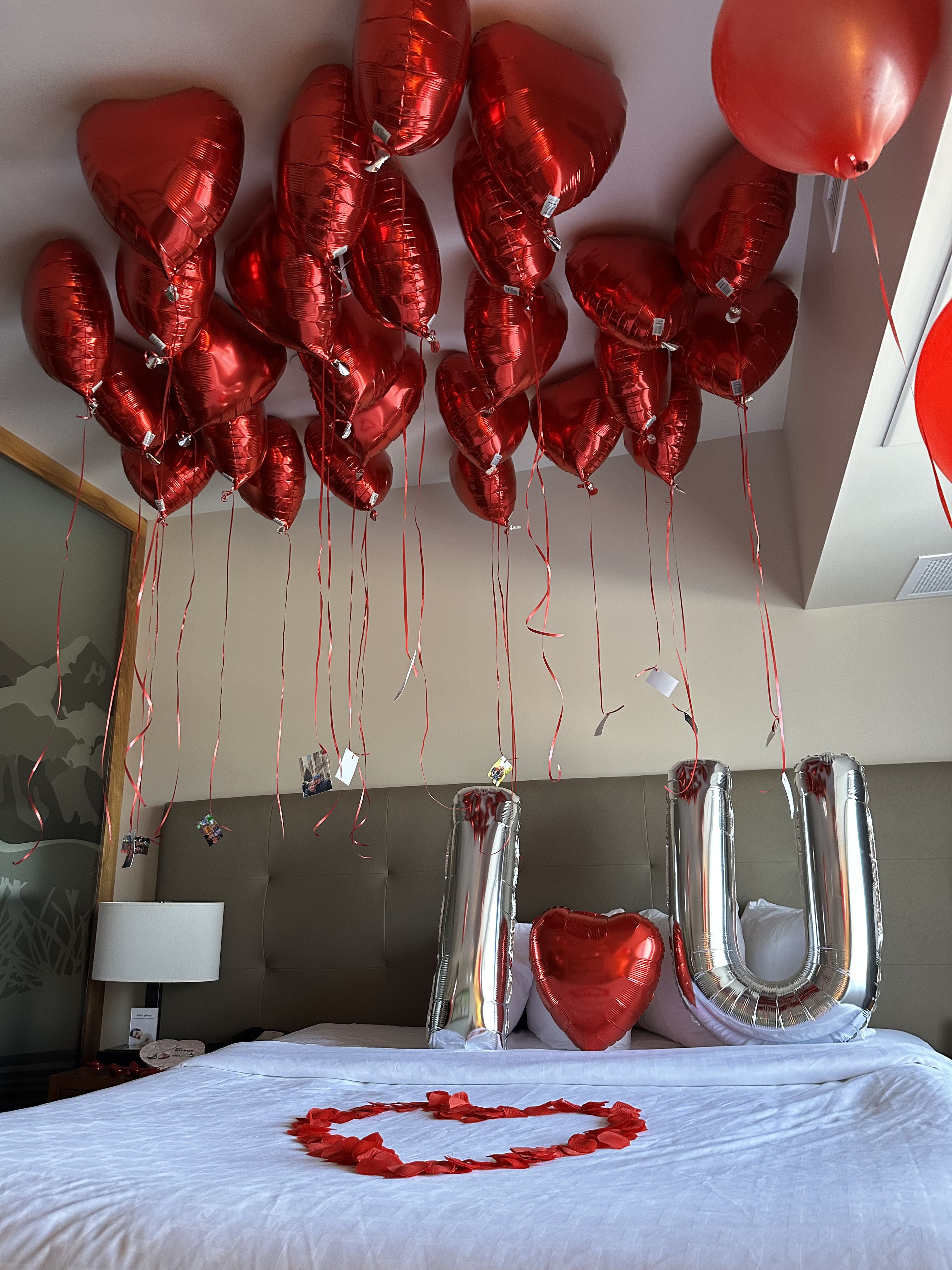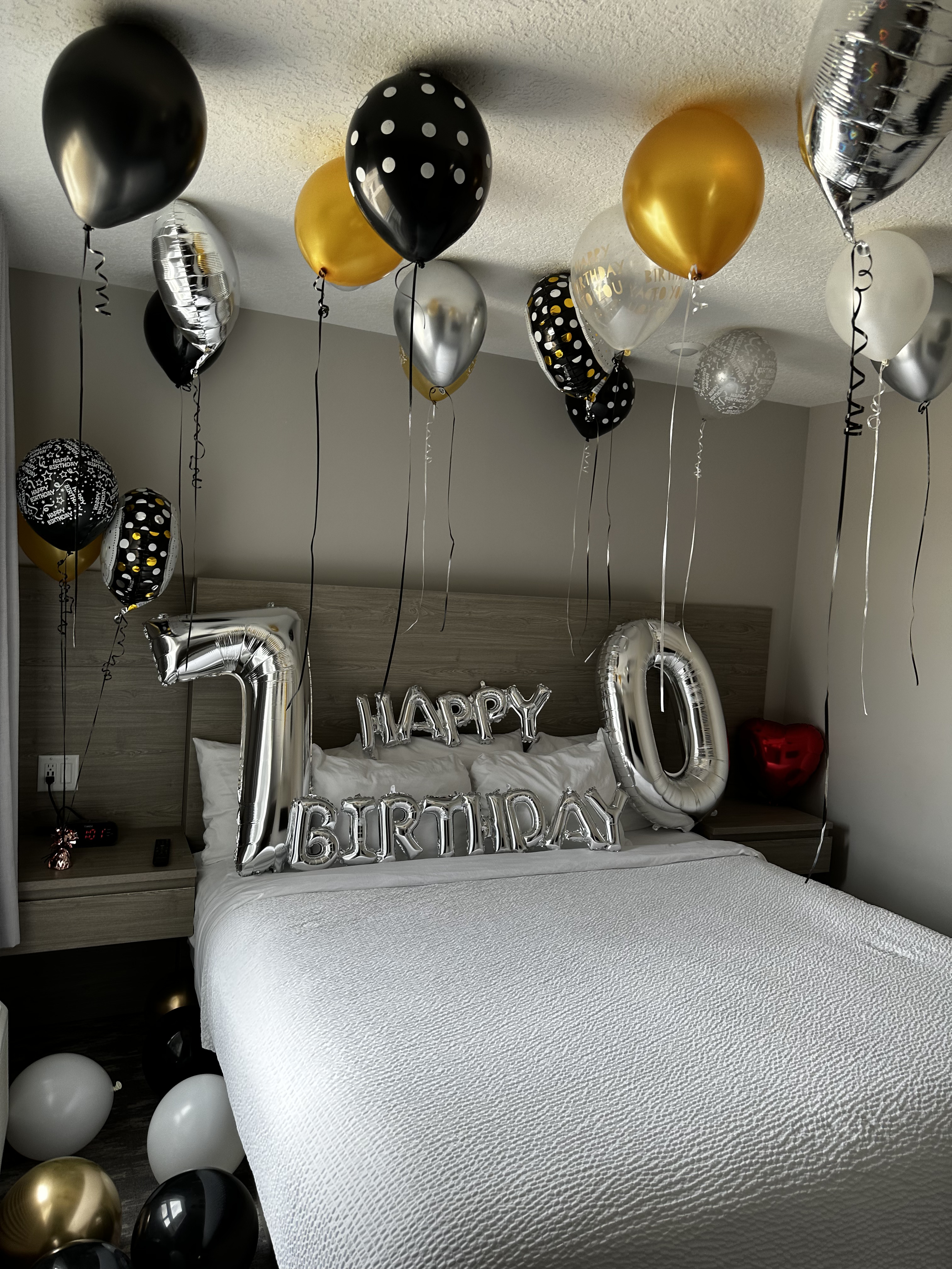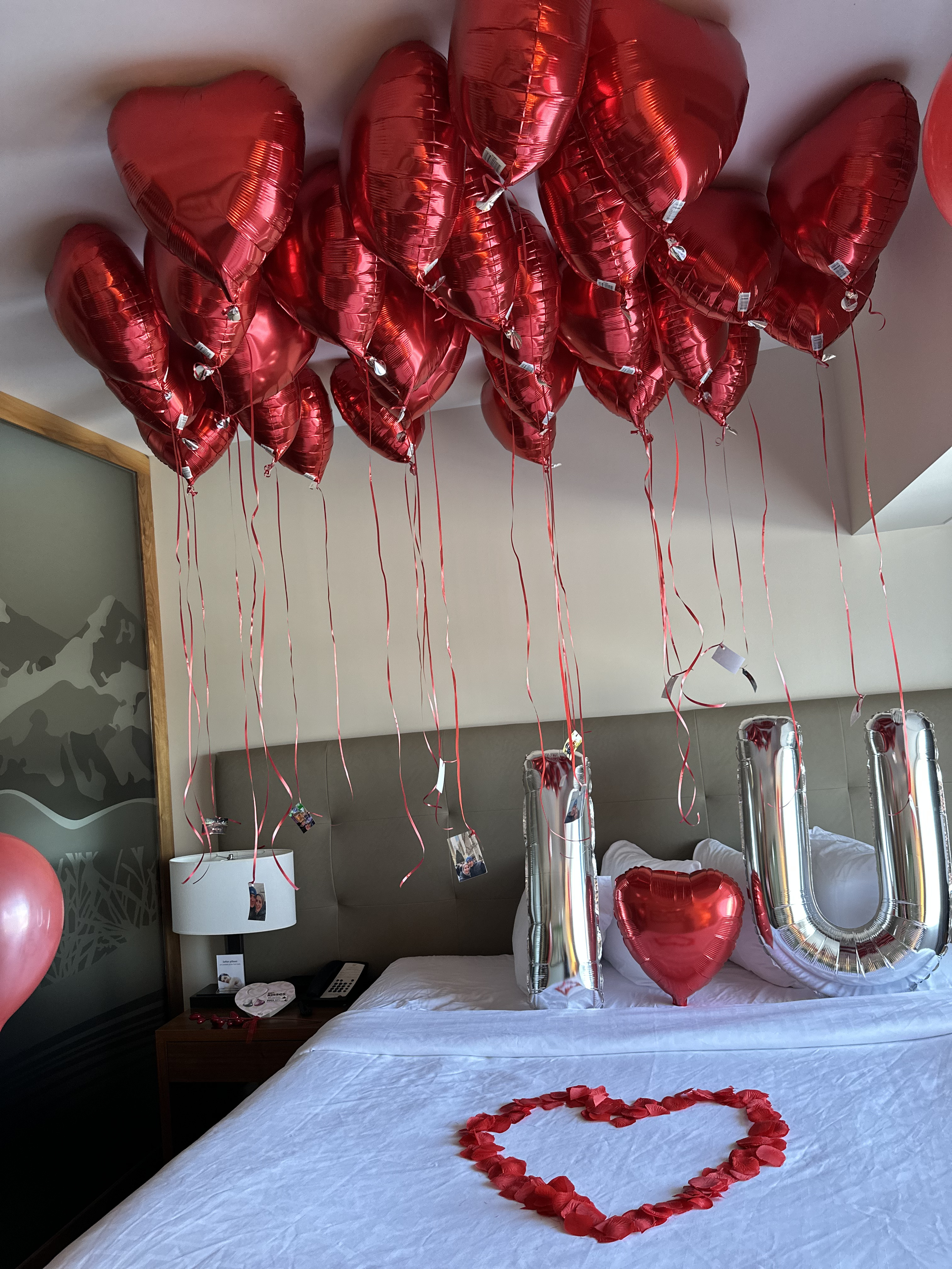 Upon entering your hotel room, you’ll be welcomed by a burst of color and playfulness. Our carefully curated balloon clusters, thoughtfully arranged around the room, add a unique flair to your surroundings. From elegant balloon garlands draping over headboards to whimsical balloon bouquets adorning tabletops, each element is designed to create a warm and inviting ambiance.